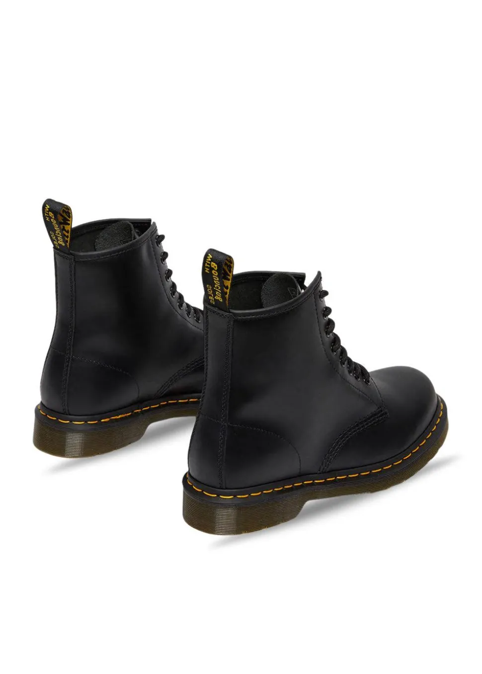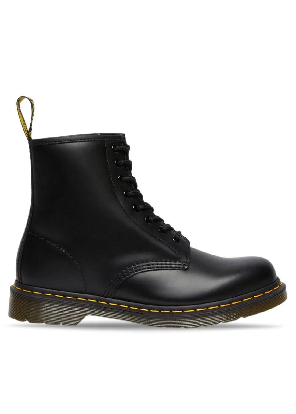 1460 er den helt originale Dr. Martens støvle. Støvlen har 8 snørehuller, glat læder, rillede sider, hælstrop, gul syning og en behagelig luftpudesål.