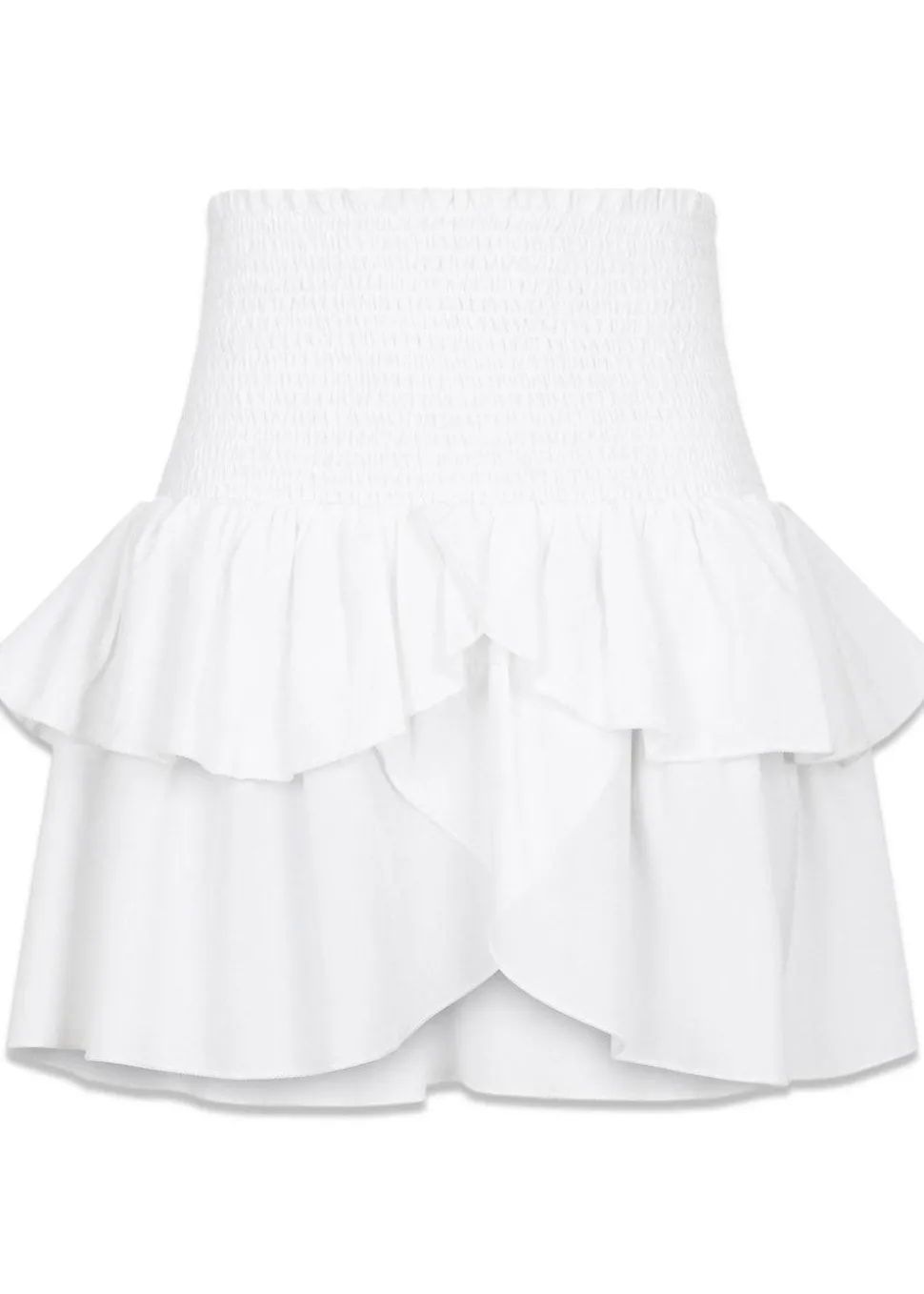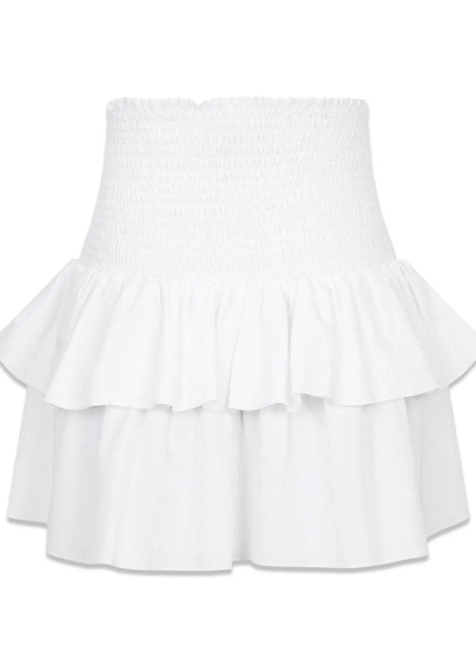 Carin er en hvid nederdel fra Neo Noir med kort længde og bred smock i livet. Nederdelen har flæsedetalje og løs pasform og kan både styles som en nederdel og top.