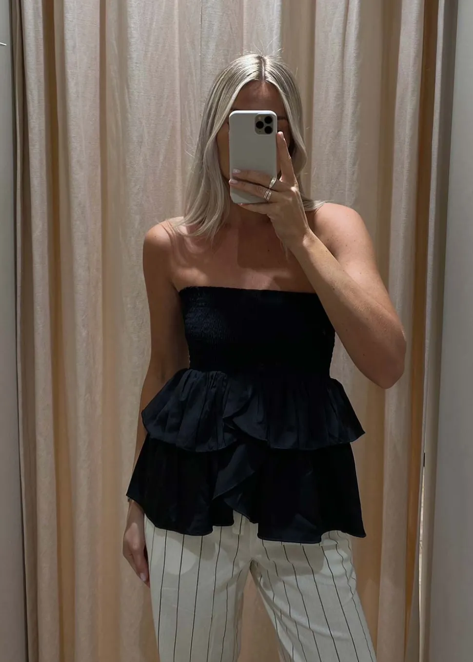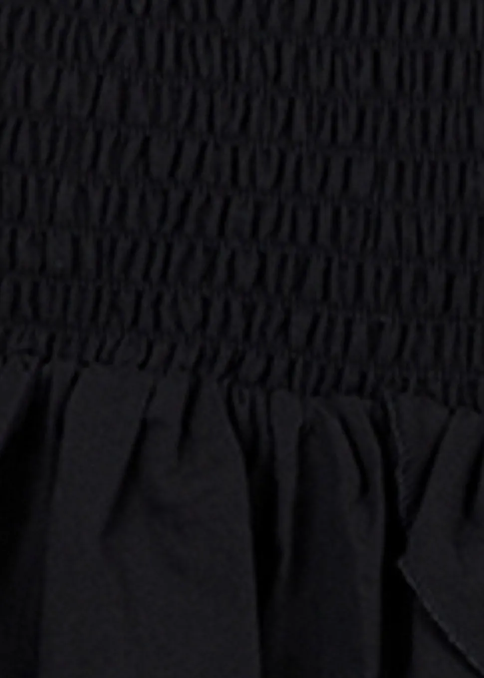 Carin er en sort nederdel fra Neo Noir med kort længde og bred smock i livet. Nederdelen har flæsedetalje og løs pasform og kan både styles som en nederdel og top.