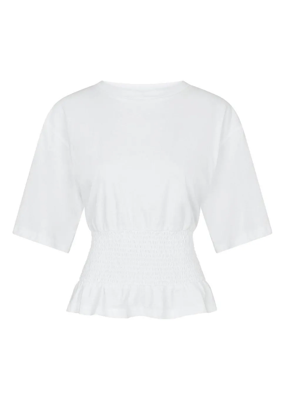 Boxy t-shirt med smocki taljen. T-shirten kommer i en lækker og blød bomuldskvalitet. Modellen er 176 cm og er iført størrelse 36.