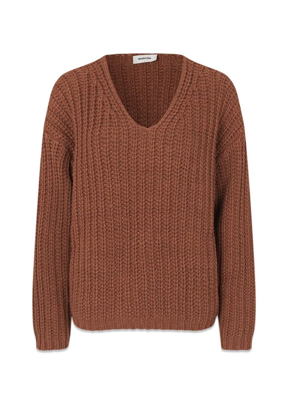 Felipemd v-neck er en chunky striktrøje i farven Maple. Strikken har en afslappet pasform, v-udskæring og lange ærmer med ribkant forneden.
