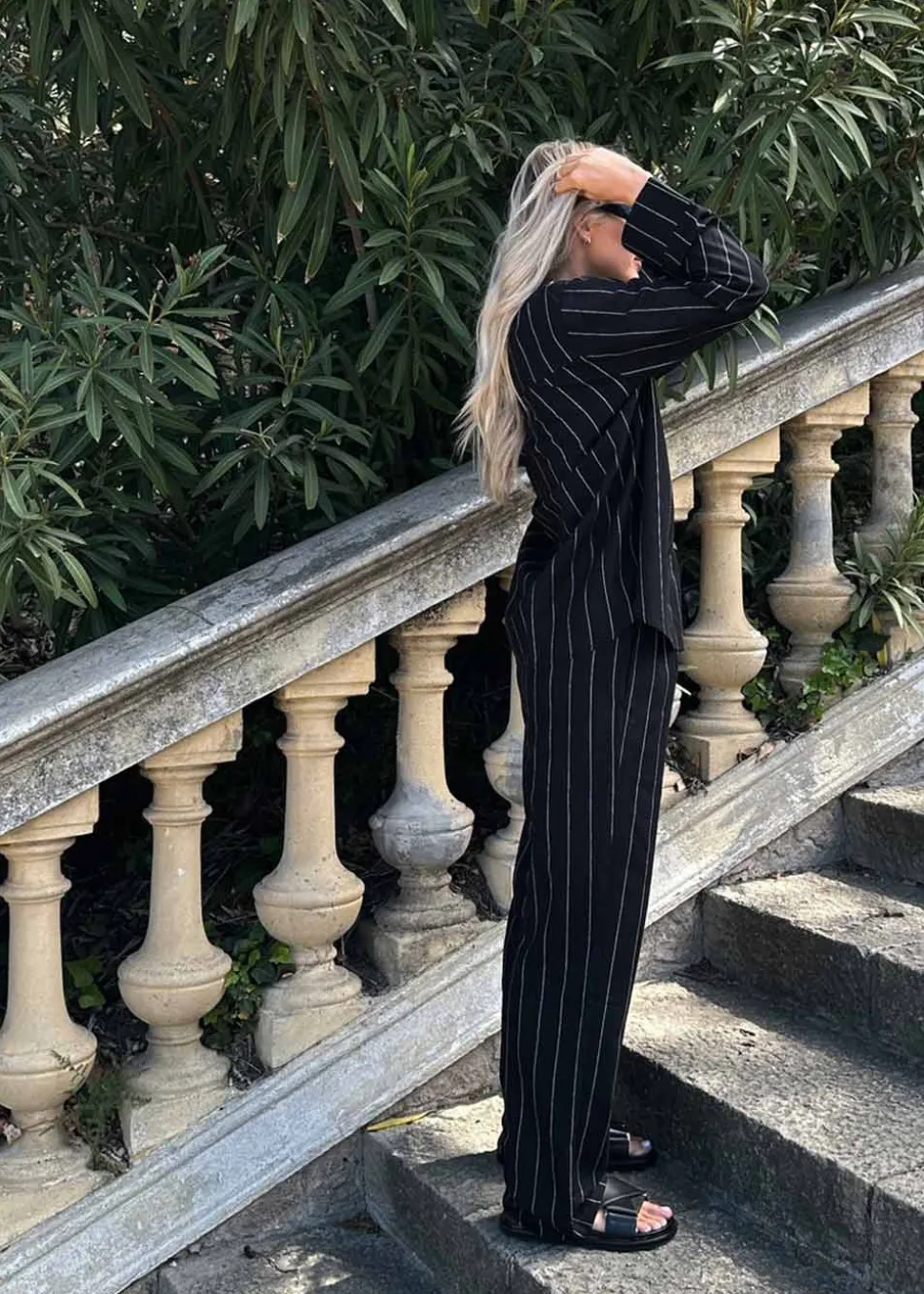 FiaMD pants i sort med tynde hvide striber er et par lækre bukser i hørkvalitet. Bukserne har et loose fit med elastik i taljen, bindebånd i livet og lommer i siden.