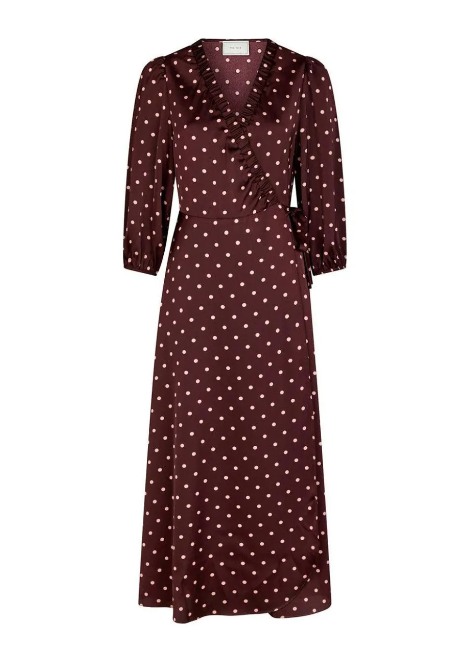 Midi-lang slå-om kjole med 34 ærmer i et prikket print. Elastik ved halsudskæringen giver et draperet look.