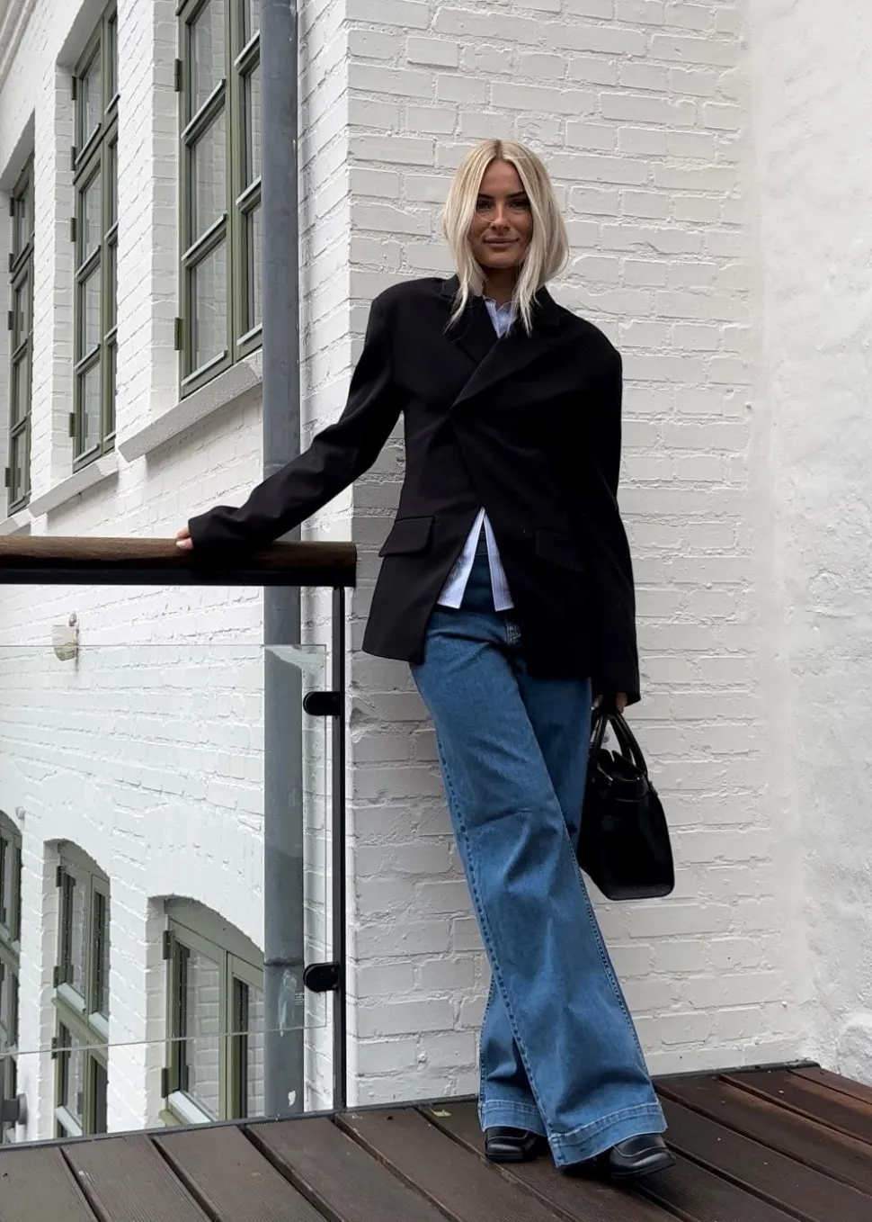 OSLuxury er en sort blazer fra Oval Square med en tætsiddende pasform, reverskrave og asymmetrisk knaplukning foran. Den har to lommer foran, skulderpuder og slidser ved manchetterne.