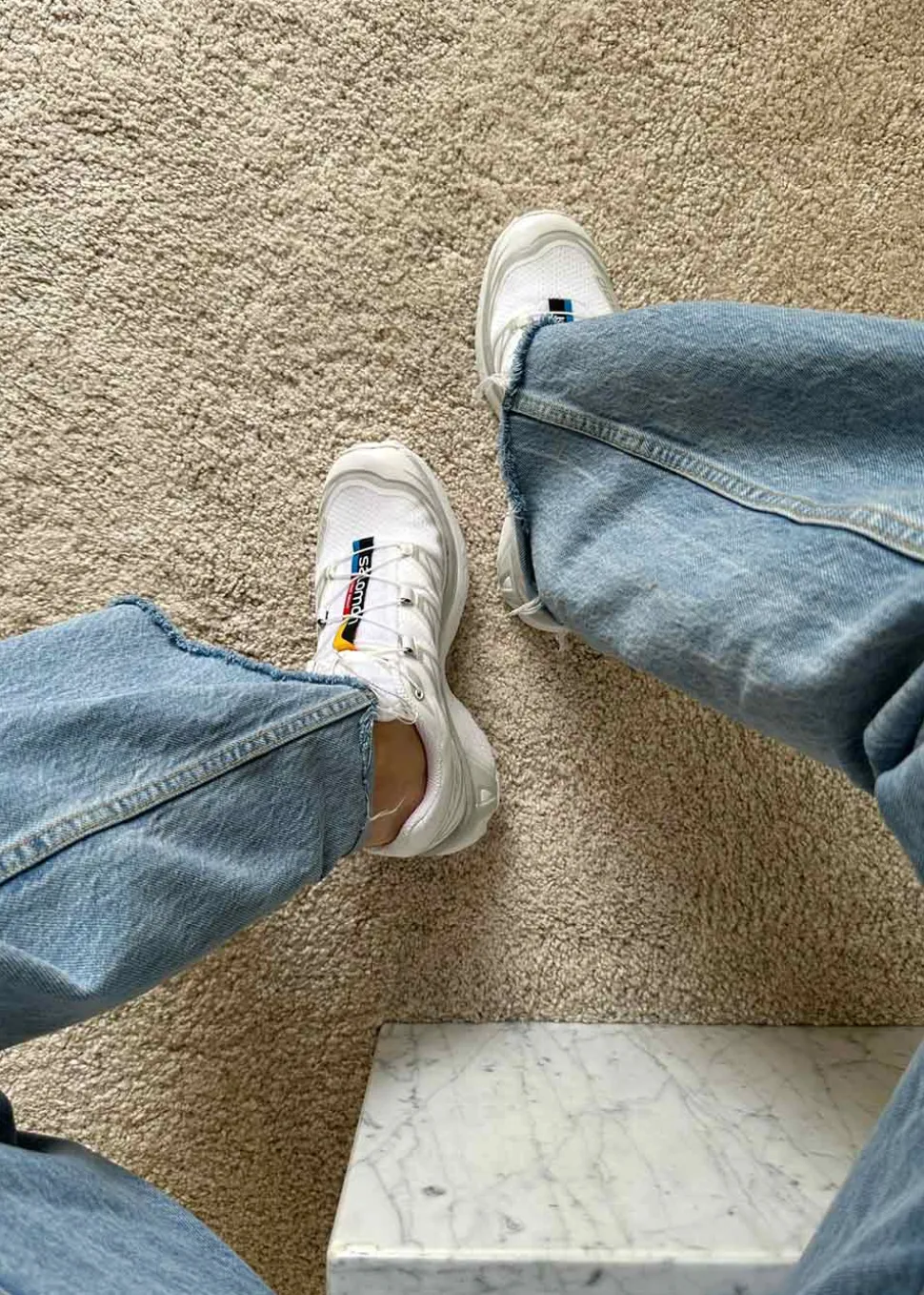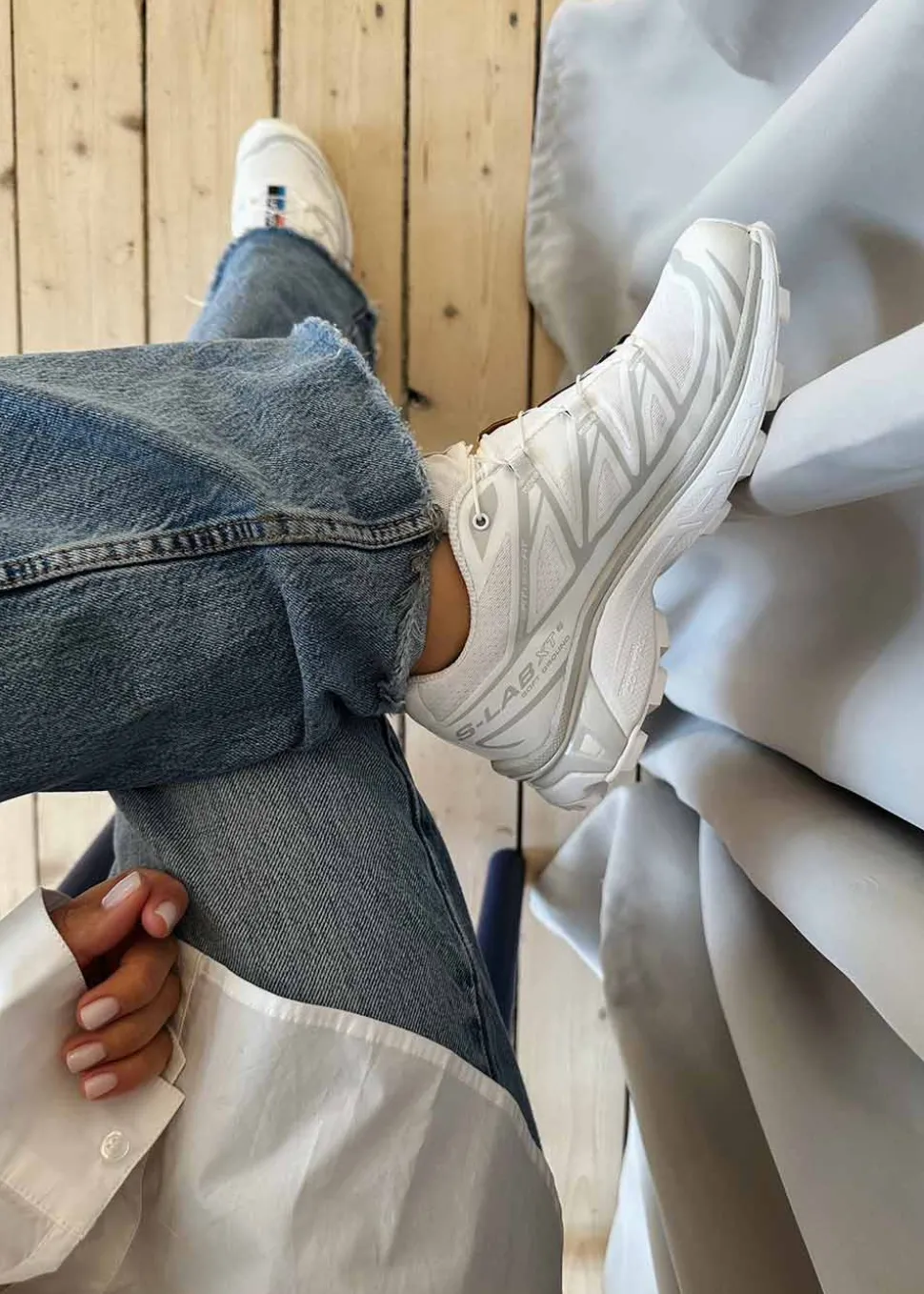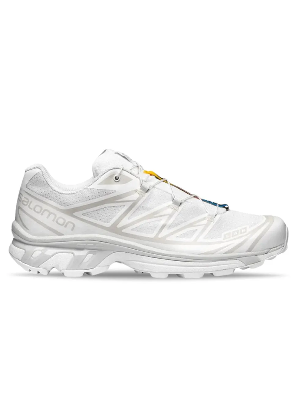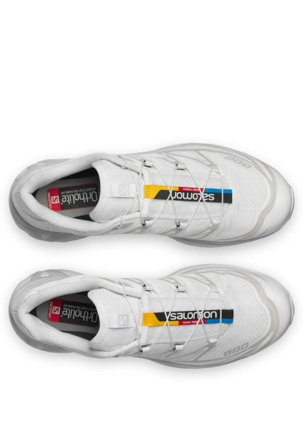 Den populære XT-6 sneaker fra Salomon i hvid med logo og kontrastdetaljer. Skoen har en rund snude og lukkes med Quicklace.