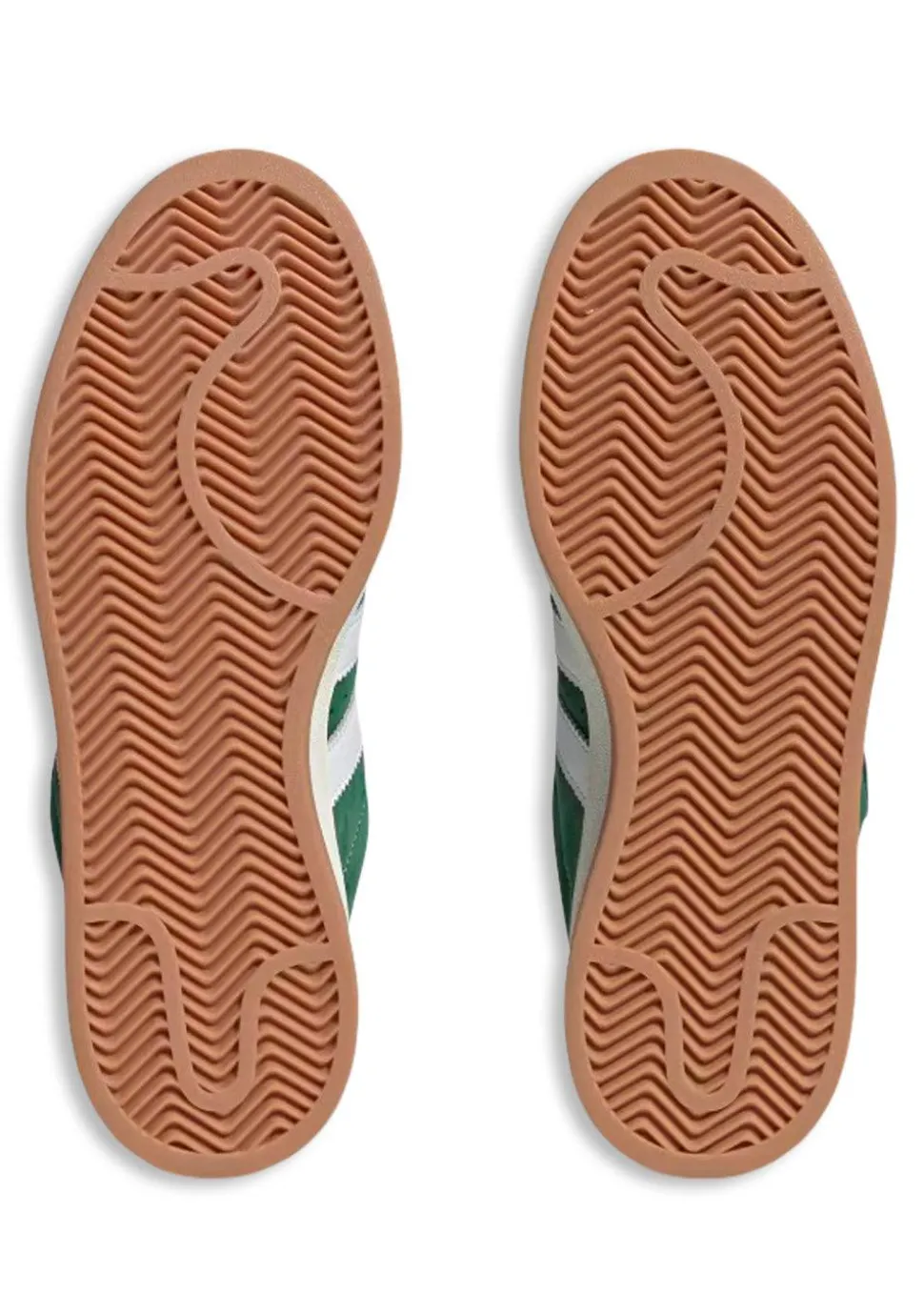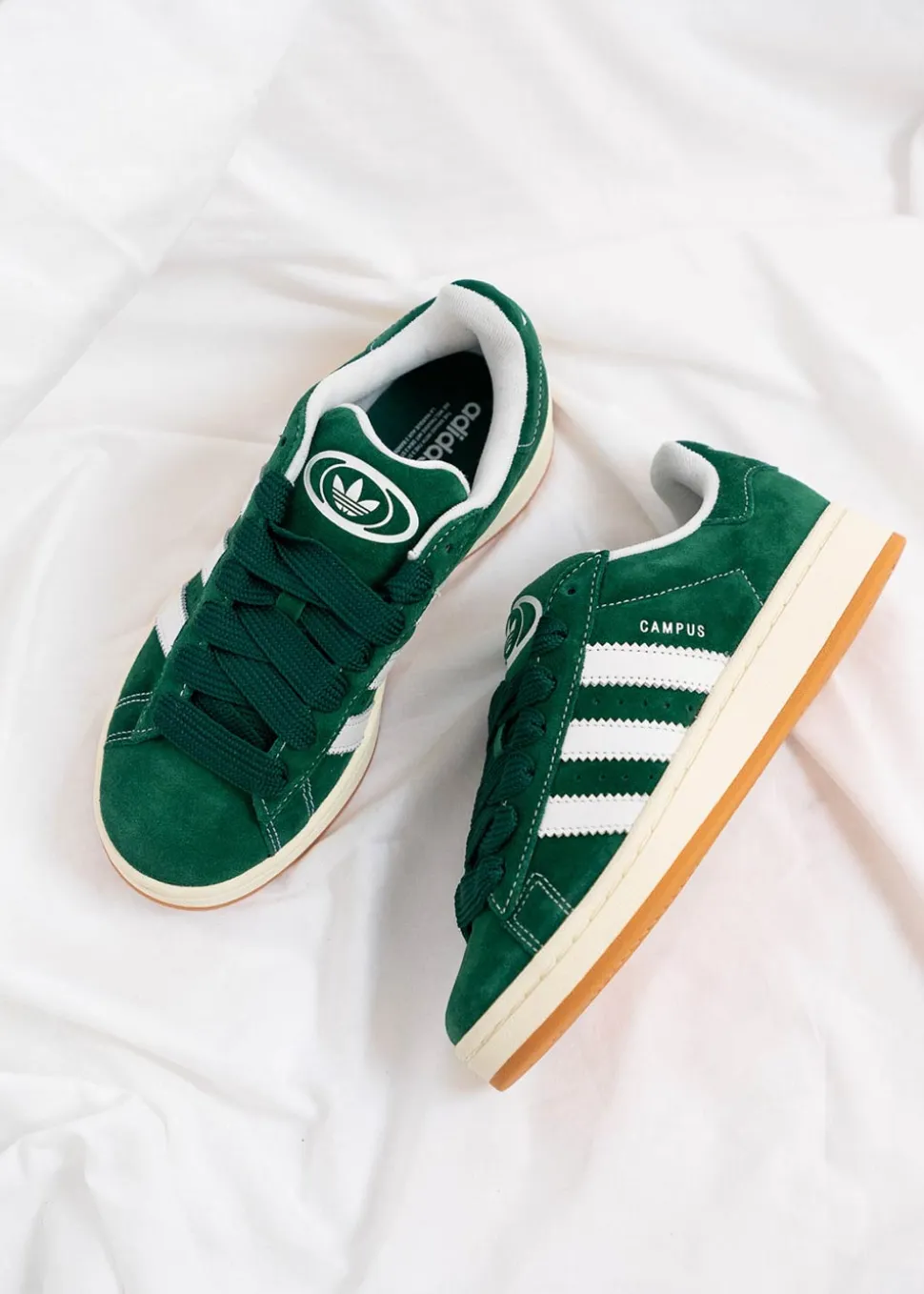 Campus 00S fra Adidas i en grøn med ruskindsdetaljer, tykke snørebånd, takkede Adidas striber på siden og logo foran. Der følger grønne snørebånd med, som man selv kan udskifte med de hvide for et andet udtryk.