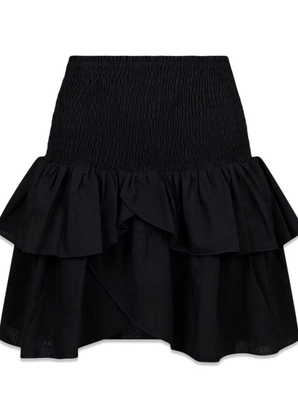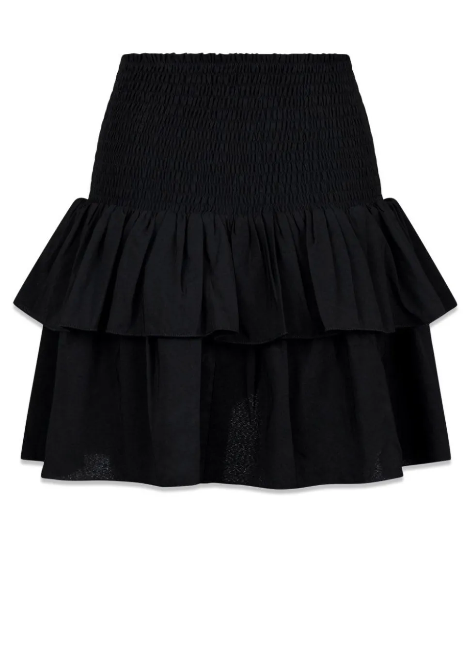 Carin er en sort nederdel fra Neo Noir med kort længde og bred smock i livet. Nederdelen har flæsedetalje og løs pasform og kan både styles som en nederdel og top.