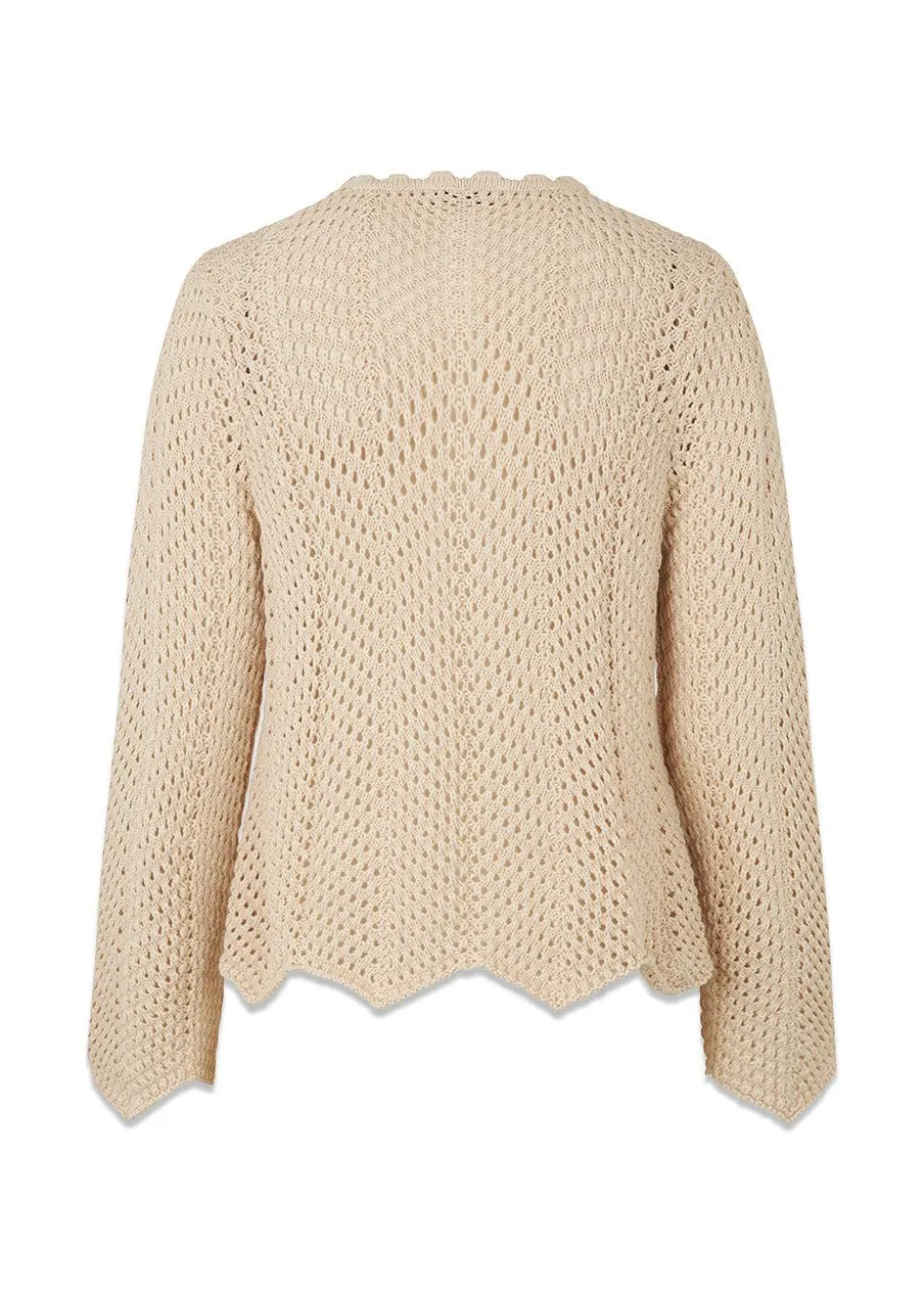 CaryMD o-neck i den flotte lyse Summer Sand er en hæklet top med detaljerede kanter, rund hals og lange ærmer.
