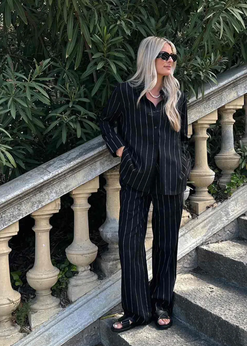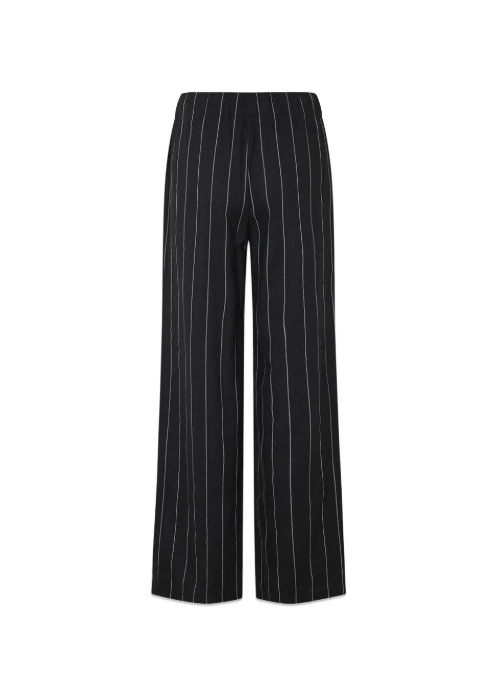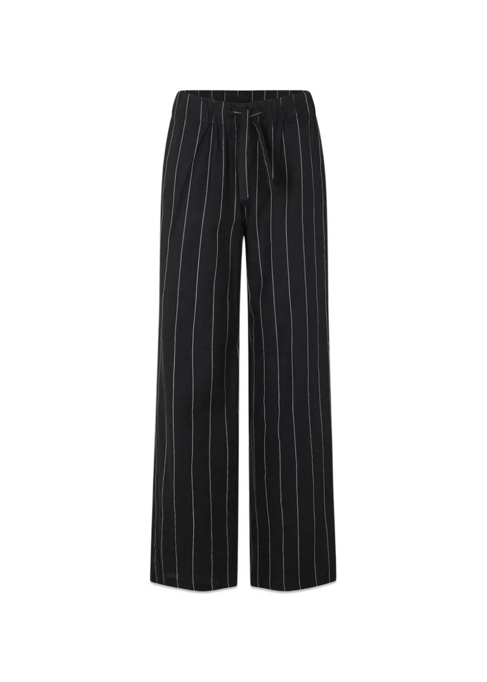 FiaMD pants i sort med tynde hvide striber er et par lækre bukser i hørkvalitet. Bukserne har et loose fit med elastik i taljen, bindebånd i livet og lommer i siden.