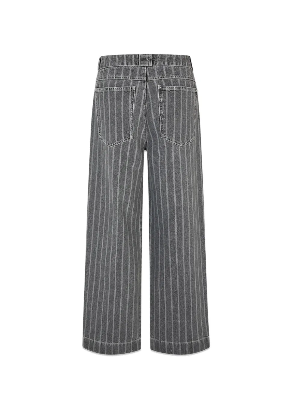 Jeans fra Mads Nørgaard i en grå vasket farve med hvide striber og hvide syninger. Halvlav talje, brede ben og store lommer både foran og bagtil. Bukserne har en afslappet pasform.