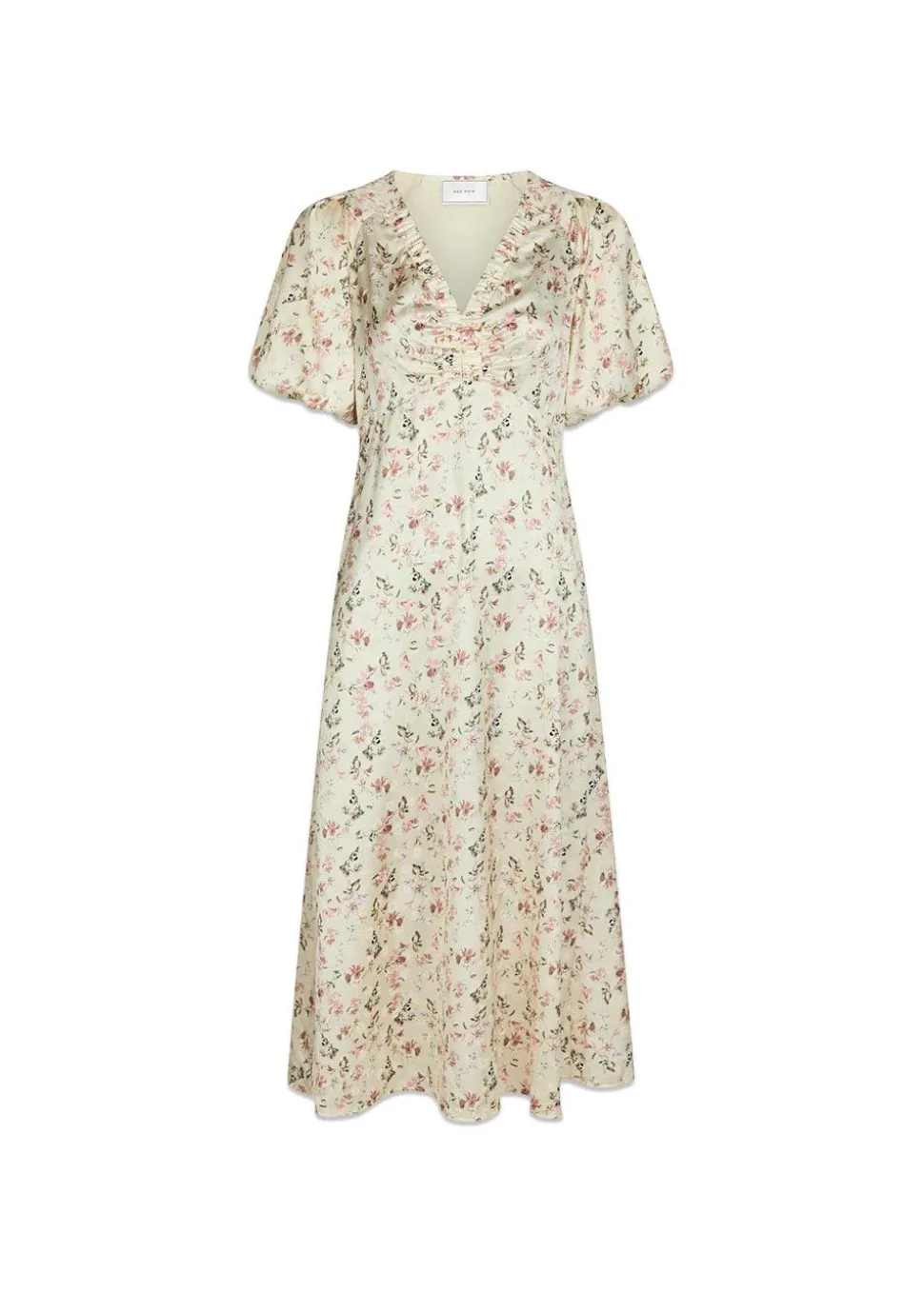- Lang kjole med blomsterprint i satinkvalitet