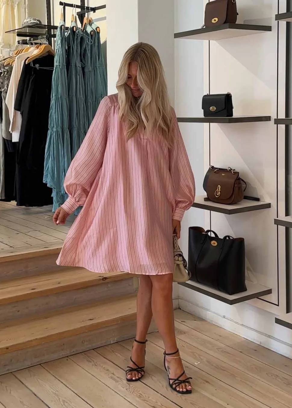 - Kort, lyserød kjole med tynde striber