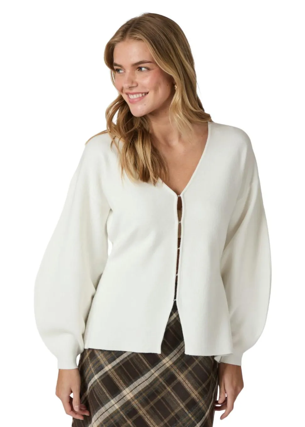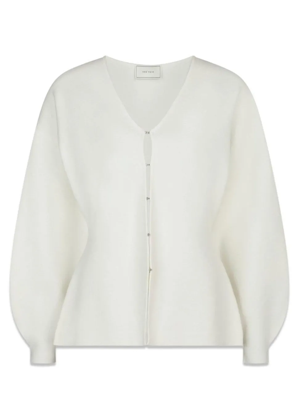 Strikket bluse i figursyet snit, der lukkes med hægter ned foran. Ærmerne er brede med smal afslutning. Modellen er 176 cm høj og er iført en str. 36.